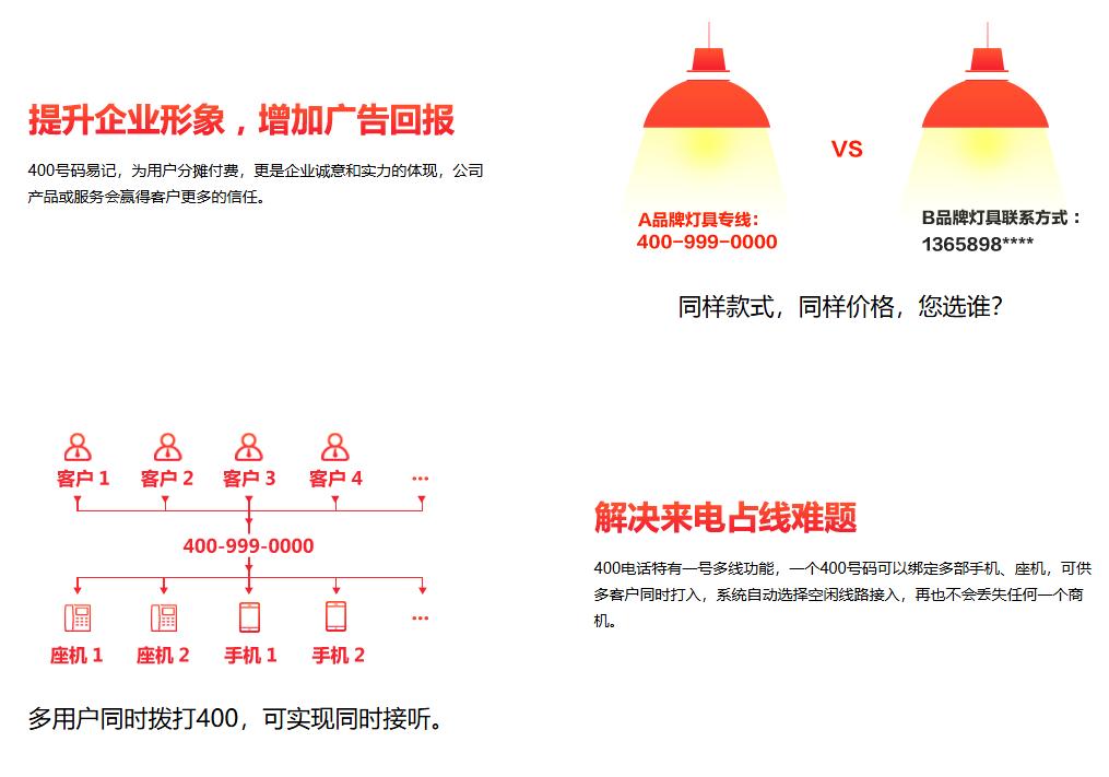 400电话是绑定在你原有的任何运营商的固定电话、手机上(类似呼叫转移),而不需要另外迁入电信或者联通的线路。可以同时支持20门以上的电话,通过顺序呼转、随机呼转、循环呼转、语音导航(类似中国电信10000;业务咨询请按1;技术支持请按2;售后服务请按3……)转接至客户想要的客服专员上,以第一时间解决客户的咨询、疑难。